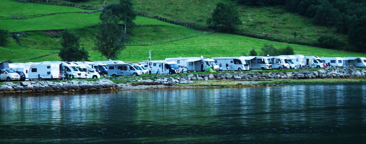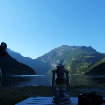 Das Beste ist natürlich, mit dem Wohnmobil in erster Reihe zu stehen! Wie aber kommt man dahin, angesichts der vielen Wohnmobilisten mit dem gleichen Wunsch? Der durchschnittliche Womotouri wird morgens irgendwo losfahren bis nachmittags oder abends unterwegs sein, um sich dann einen Platz zu suchen. Am Geiranger sind dann bereits mehrere vordere Reihen besetzt. Also hilft nur Eines: noch etwas länger bleiben und am nächsten Morgen beobachten, wer sich zum Aufbruch fertig macht. Und dann - sobald ein Platz frei wird, das Frühstücksgeschirr festhalten und mit Schlafdreck in den Augen an den "richtigen" Platz fahren. Aber bitte noch an das Stromkabel denken! Wenn dann das Wetter mitspielt und Du Deinen Tisch, Deinen Stuhl, Dein Frühstück zum Fjord hin ausrichtest, dann vergisst Du alles hinter Dir, über Dir oder gegenüber.... Dann hast Du Deine Welt, Deinen Geiranger, Dein Norwegen!
